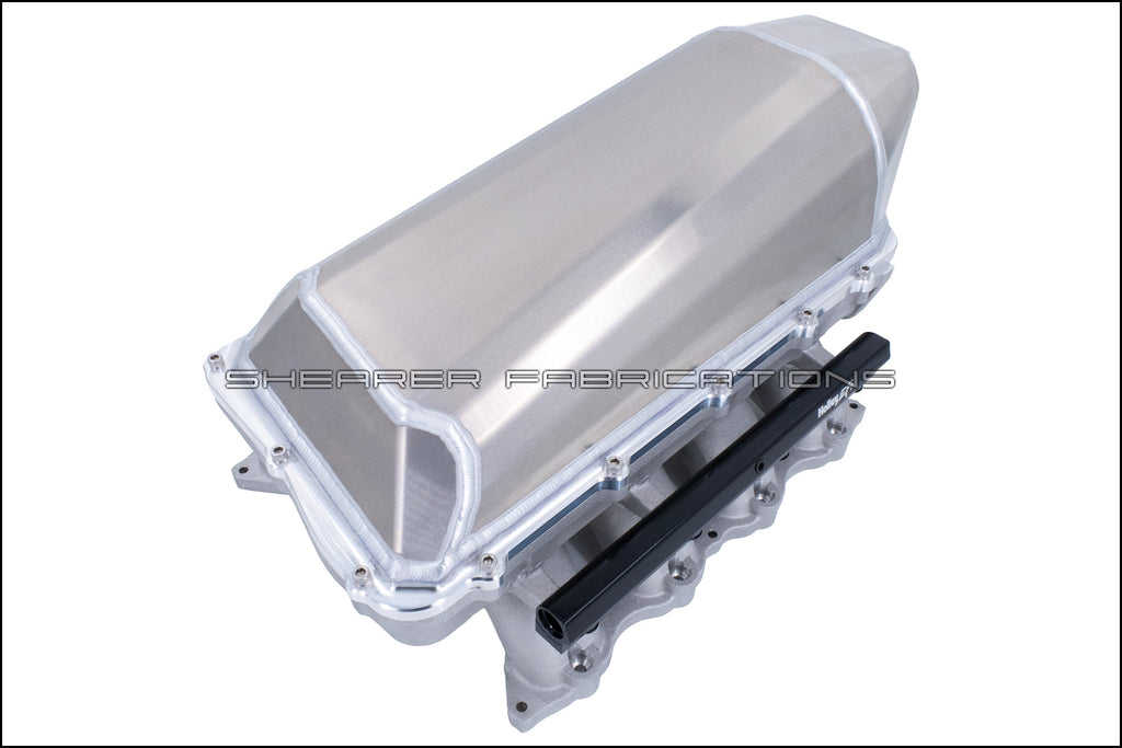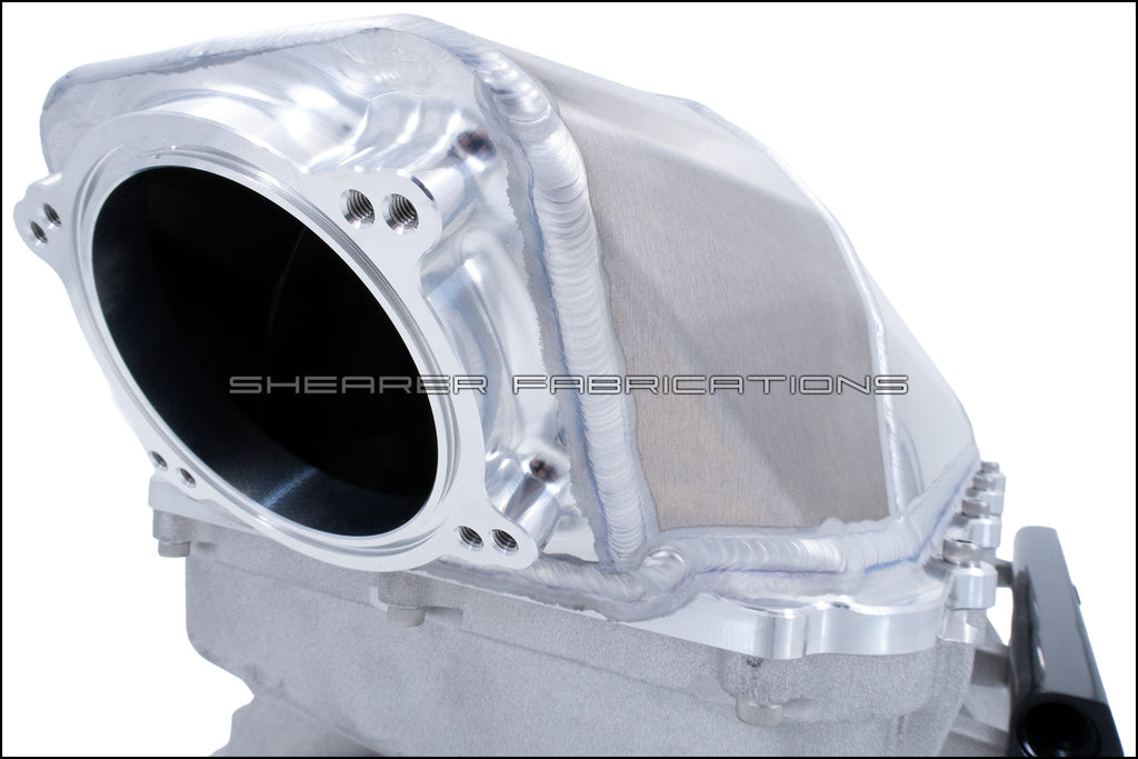 Shearer Fab's sheetmetal lid for the Holley HiRam Coyote intake manifold. You have the choice of two throttle body flanges! A dual bolt pattern Coyote flange that fits Mustang and Truck throttle bodies, or a 105mm LS pattern throttle body.
